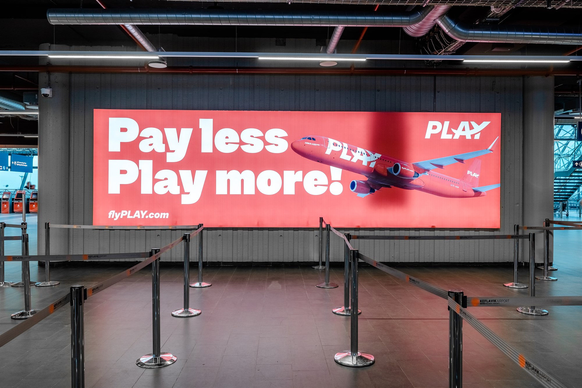 Located at the check-in desks on the way up to security. Size 500 x174cm