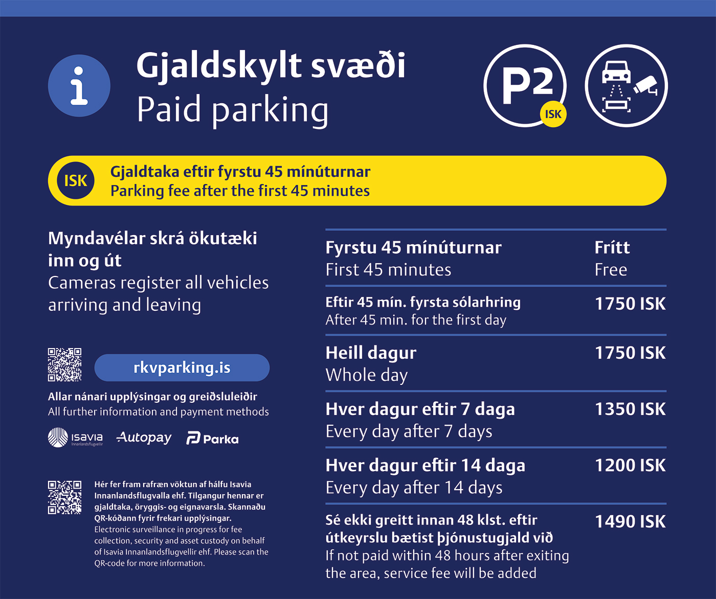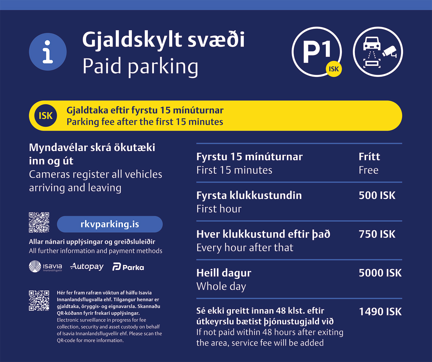 Við minnum gesti okkar á að nýta sér greiðslumöguleika Autopay eða Parka appið áður en ekið er út af bílastæðinu til að komast hjá óþarfa kostnaði. Ef ekki er greitt fyrir stæðið 48 klst. frá útkeyrslu berst reikningur í heimabanka að viðbættu 1.490 kr. þjónustugjaldi.